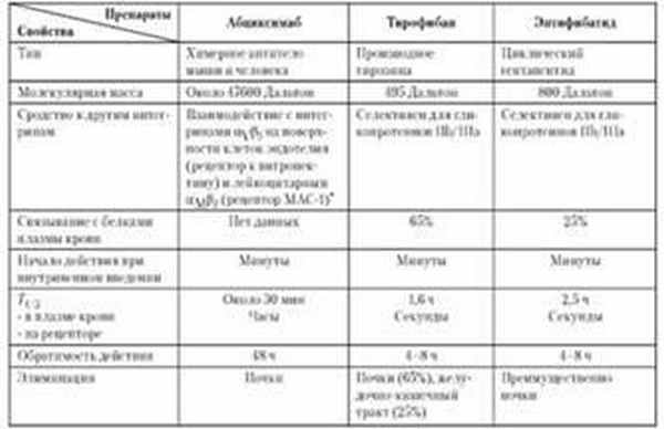 Фармакологические свойства некоторых блокаторов гликопротеиновых IIb/IIIа рецепторов тромбоцитов представлены в таблице 4 [4].