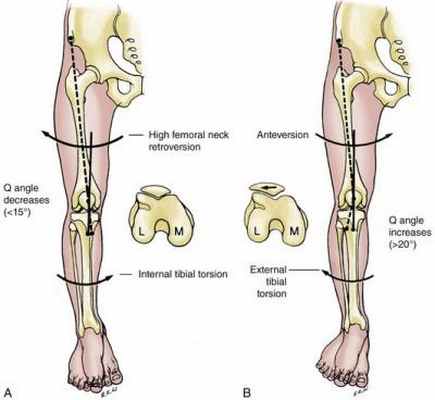 Предполагается, что любое увеличение угла Q повышает латеральное воздействие на надколенник.