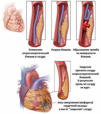 Суживающая просвет атеросклеротическая бляшка может внезапно разорваться, тогда на ней образуется кровяной сгусток - тромб. Этот сгусток способен быстро и полностью перекрыть просвет артерии. При этом поступление крови к участку сердца, кровоснабжаемого этой артерией, полностью прекращается. Через 15 минут после остановки кровотока клетки сердечной мышцы в зоне ишемии начинают гибнуть, а через 6-8 часов вся эта зона полностью умирает - развивается инфаркт миокарда.