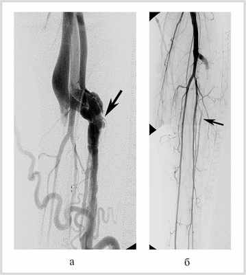 Тромбоз самораскрывающихся эндопротезов, установленных в бедренную артерию и в переднюю большеберцовую артерию (рис. 2), отмечался в 2 наблюдениях в сроки до 2 нед, что, однако, не привело к ухудшению состояния больных и не потребовало дополнительного лечения, симптоматика регрессировала вследствие ликвидации артериовенозного сброса. Это объясняется тем, что артериовенозный сброс оказывает большее влияние на гемодинамику конечности, чем окклюзия артерии, и при его длительном существовании развивается богатая сеть коллатералей.