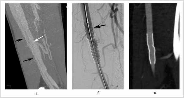 Рис. 2. Травматический артериовенозный свищ передней большеберцовой артерии со сбросом в переднюю большеберцовую вену. Эндопротезирование передней большеберцовой артерии.