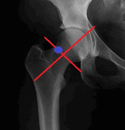 Под контролем флюороскопа рисуется виртуальная линия разделяющая головку и шейку бедра и другая линия перпендикулярно заданной. Несколько выше точки их пересечения маркируется отметка.