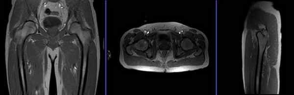 Планирование коронарных срезов на аксиальной плоскости; угловое расположение блока пересекает вертлужную впадину и головку бедренной кости пополам. Проверьте расположение блока на 2-х других плоскостях. Соответствующий угол должен быть получен в сагиттальной плоскости (рассекая головку бедренной кости и вертлужную впадину). Эти срезы должны полностью покрывать тазобедренные суставы, от седалищных бугров до уровня лобкового симфиза.