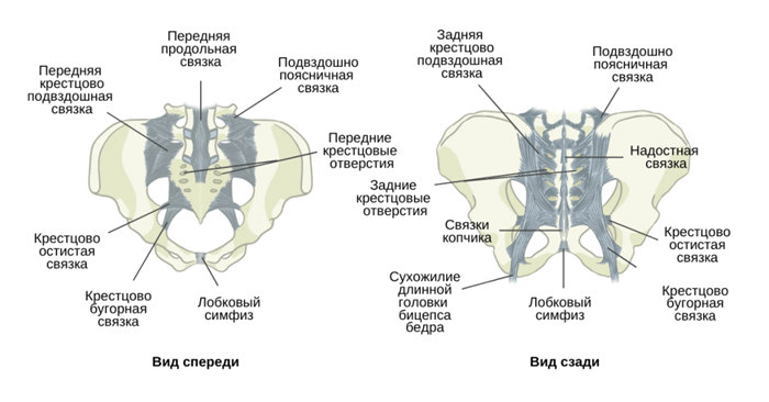 Связки крестцово-подвздошных суставов, вид сзади. Благодаря тугому натяжению связок объем движений в крестцово-подвздошных суставах очень мал. Треугольное пространство между задним отделом подвздошного гребня и задней поверхностью крестца заполнено крепкой межкостной крестцово-подвздошной связкой. Связки крестцово-подвздошных суставов и таза, вид спереди. Вентральные связки крестцово-подвздошного сустава преимущественно формируют его капсулу и обладают невысокой прочностью. При МРТ в аксиальной проекции визуализируются синовиальная полость лобкового симфиза и укрепляющие его спереди и сзади связки. Нестабильность данного сустава может возникать в результате спортивных травм, деторождения, инфекционных и неинфекционных артритов. К передней поверхности лобковых костей возле симфиза прикрепляется апоневроз прямой мышцы живота и длинной приводящей мышцы, который в случае отрыва может служить источником боли в области лобка.
