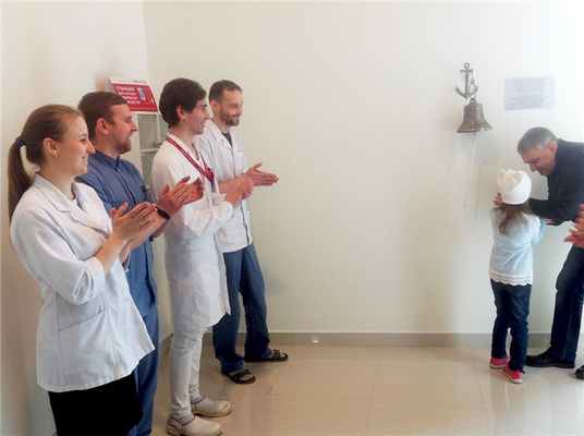 По недавно зародившейся традиции, каждый пациент, прошедший курс протонной терапии, ударяет в настоящий корабельный колокол, подаренный МИБС. Поздравить Катюшу с окончанием курса вышла лечившая ее команда медиков.