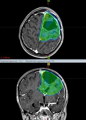 Протонная терапия, план лечения астробластомы. Зона, указанная синим и зеленым цветом, получит высокую дозу ионизируюшего излучения, гибельного для опухоли. Остальной мозг – защищен от радиации благодаря точности метода протонной терапии и высокой квалификации врачей МИБС.