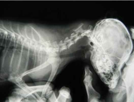 Рентгеновский снимок позволяет достаточно четко визуализировать область АА сустава, преимущественно у карликовых пород собак, ввиду очень незначительной толщины позвонков (средняя толщина дорсальной дужки атланта в период с 1-3 месяцев составляет 1- 1.2 мм. (McCarthy R.J., Lewis D.D., 1995)). Также по ренгеновскому снимку можно оценить увеличение расстояния между позвонками С1 и С2.