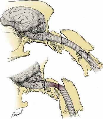 Рисунок 1. Вверху – нормальное анатомическое соединение первых двух шейных позвонков. Внизу – атлантоаксиальный подвывих развивающийся в результате отделения зубовидного отростка от тела атланта и последующей компрессии спинного мозга. Источник «Handbook of Veterinary Neurology 5th Edition»