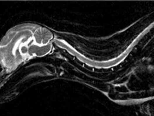Также могут быть замечены симптомы поражения мозга, что может быть следствием нарушения циркуляции ликвора и развитием или прогрессированием гидроцефалии, которая часто у 95 % карликовых пород собак(Braun,1996) присутствует, но без клинических признаков. У животного гидроцефалия может также сопровождаться сиринго(гидро)миелией.