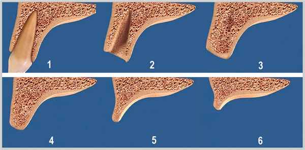 Послу удаления единицы лунка на месте зуба сужается примерно на 30%. Затем процесс останавливается, переходит в латентную стадию. Затем наблюдается смещение ряда, нагрузка на челюсть распределяется неравномерно, что только ухудшает состояние. В зависимости от протекания данного процесса аномалия характеризуется при помощи различных параметров.