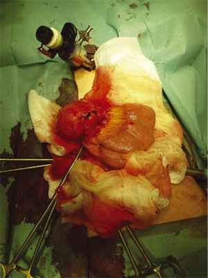 Для хирургического лечения пациентку 09.02.15 госпитализировали в клинику ГНЦ. При компьютерной томографии констатировано внеорганное кистозное новообразование, которое не увеличилось в размерах по сравнению с предыдущими исследованиями (рис. 1). Лапароскопическая С.Э. с удалением добавочной селезенки и новообразования, расположенного в корне БТК, выполнена 18.02. Обращало внимание варикозное расширение вен, окутывающих новообразование брыжейки, свидетельствующее о длительном ее существовании. Кистозное новообразование вылущено из его ложа при помощи ультразвукового диссектора. Селезенка, добавочная селезенка и новообразование извлечены из брюшной полости через единый мини-лапаротомный разрез в надпупочной области (рис. 2, 3, 4, 5).
