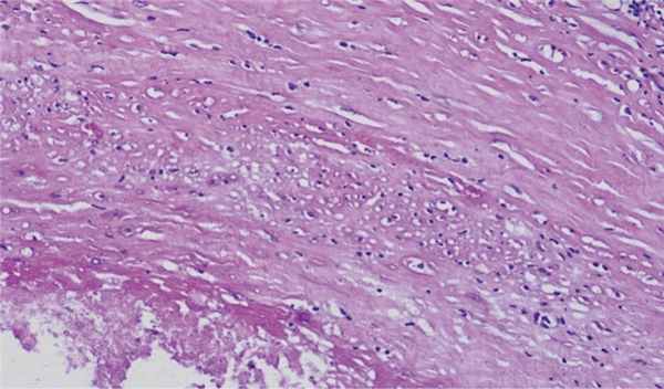 Макропрепараты: селезенка массой 400 г, размером 13×10×5 см, добавочная селезенка диаметром 0,5 см; новообразование размером 7,0×6,5×6,5 см, на разрезе представлена кистозной полостью с толщиной стенки до 0,3 см, заполненной серо-желтыми замазкообразными массами и структурами, напоминающими волосы (рис. 3, 4). Микроскопически: гистоархитектоника селезенки сохранена; фолликулы небольших размеров, без центров размножения. Периартериолярные зоны развиты умеренно. Красная пульпа пониженной клеточности и резко полнокровна. Просветы сосудов в ней заполнены гемолизированными эритроцитами. В селезеночных тяжах среди немногочисленных лимфоидных клеток рассеяно много сидерофагов и зерен гемосидерина. Структура добавочной селезенки аналогична основной. Стенка кистозной полости представлена фиброзной тканью с лимфоидной инфильтрацией и участками хрящевой ткани, внутренняя выстилка тотально некротизирована; в просвете кисты аморфные массы с микрокальцинатами (см. рис. 5).