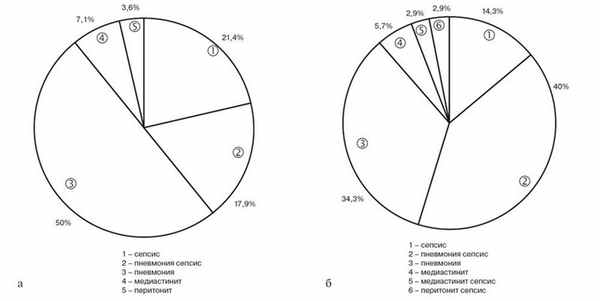 Выявлено незначительное снижение частоты инфекционных осложнений и перераспределение их по нозологиям. В динамике частота развития пневмонии снизилась с 2,3 до 1,3%, сепсиса — с 1 до 0,5%. При этом чаще регистрировалась пневмония с последующим развитием сепсиса (1,5%). Эти изменения отражаются в структуре инфекционных осложнений: снизилась доля пневмонии с 50 до 34,3%, сепсиса — с 21,4 до 14,3%; возросла частота развития пневмонии с последующей генерализацией инфекции и сепсисом с 17,9 до 40% (рис. 1). Рисунок 1. Структура инфекционных осложнений в 2006—2007 гг. (а) и в 2008—2009 гг. (б).