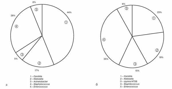 Рост клинически значимой микрофлоры (грибы рода Candida, Klebsiella, Acinetobacter, Enterococcus, Staphylococcus) в 2006—2007 гг. обнаружен у 18 пациентов, что составило 18,4% от числа обследованных для выявления бактериемии, в 2008—2009 гг. — у 26 (14,3%). Структура выделенной микрофлоры представлена на рис. 2. Рисунок 2. Структура выделенной микрофлоры в 2006—2007 гг. (а) и в 2008—2009 гг. (б).
