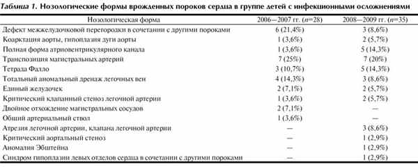 1. У детей первого года жизни с врожденными пороками сердца преобладающими инфекционными осложнениями послеоперационного периода являлись пневмония, сепсис. Частота развития инфекционных осложнений в 2006—2007 гг. составила 4,6%, за период 2008—2009 гг. снизилась до 3,8%.
