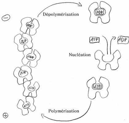 Актин, связанный с филаментом, имеет тенденцию гидролизовать свой АТФ. Это свойство, наряду с полярностью нити, лежит в основе так называемого феномена « беговой дорожки » . Действительно, (+) конец будет иметь тенденцию захватывать подавляющее большинство АТФ-актина, следовательно, способствуя полимеризации на этом конце. С другой стороны, (-) конец менее активен, актин филамента, который находится рядом с ним, провел больше времени в филаментарной форме и в основном находится в форме АДФ-актина. Следовательно, на (-) конце равновесие смещается в сторону деполимеризации.