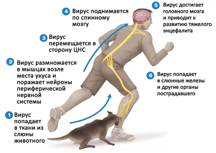 Вирус Neuroiyctes rabid передается через биологические жидкости (как правило, через слюну) и попадает в организм преимущественно в результате укуса зараженного животного. Передача инфекции может произойти и в случае непосредственного контакта слюны инфицированного животного со слизистыми оболочками или свежими ранами на коже человека. Причем животное считается заразным уже за 3-7 дней до появления клинических симптомов.
