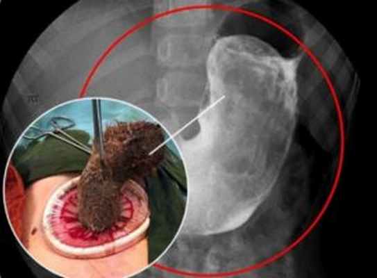 2. Трихобезоар (или волосяной шар) – безоар, образовавшийся из волос, ниток или шерсти, с примесью слизи и пищи. Часто встречаются у людей с неуравновешенной психикой, страдающих трихотилломанией, а также у лиц, работающих с волосом (работников щеточного производства, парикмахеров) [7].