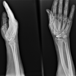 Коллеги из крупной и уважаемой больницы успели рекомендовать девушке оперативное лечение в объеме тотального артродеза лучезапястного сустава. Конечно, эта операция дает прогнозируемый и уверенный результат: болей в лучезапястном суставе не будет. Но не будет и самого лучезапястного сустава, а значит и сгибания/разгибания в кисти.