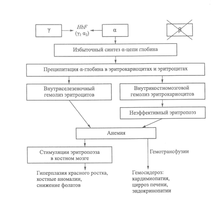 Блокада β-цепей глобина приводит к избытку α-цепей глобина, снижению образования нормального гемоглобина (HbA,α2β2) и повышенному образованию фетального гемоглобина (HbF,α2γ2) и НЬА2 (α2δ2).