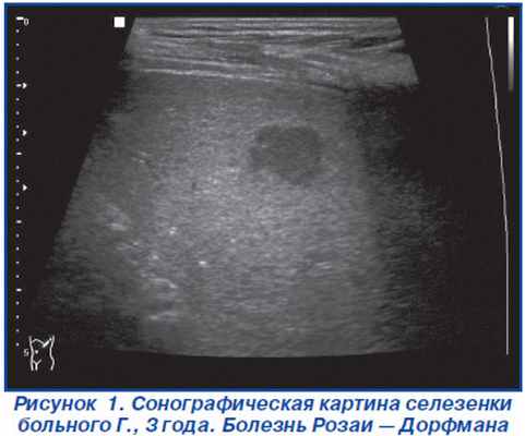Синусный гистиоцитоз с массивной лимфаденопатией встречается у детей редко. В статье приведено описание случая болезни Розаи — Дорфмана у мальчика 3 лет. Заподозрить болезнь Розаи — Дорфмана позволило возникновение лимфаденопатии, преимущественно цервикальной, с одновременным поражением экстранодальной зоны — селезенки. Для уточнения диагноза использовали УЗИ. Окончательный диагноз был установлен в результате хирургического удаления конгломерата лимфоузлов шеи, гистологического и гистохимического исследования. После проведенного оперативного вмешательства ребенок выписан для прохождения дальнейшего лечения в отделении онкогематологии.