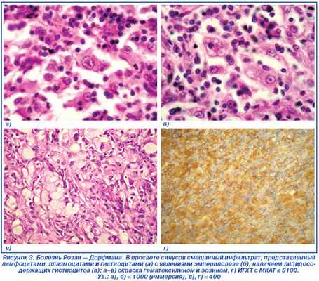 В просвете синусов отмечаются скопления крупных клеток различной формы со светлой пенистой цитоплазмой и округлым светлым ядром, смещенным на периферию клетки (липидосодержащие гистиоциты) (рис. 3в). Заключение: гистологическая картина и иммунофенотип клеток соответствуют синусовому гистиоцитозу с массивной лимфаденопатией (болезнь Розаи — Дорфмана).