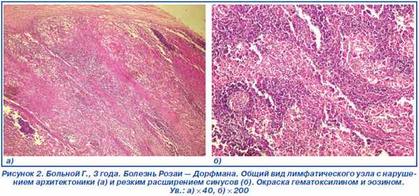 Таким образом, синусный гистиоцитоз с массивной лимфаденопатией встречается у детей редко. Заподозрить болезнь Розаи — Дорфмана позволяет возникновение лимфаденопатии, преимущественно цервикальной, с одновременным поражением экстранодальных зон (чаще всего селезенки). Для уточнения диагноза целесообразно использование УЗИ, компьютерной томографии. Окончательный диагноз устанавливается после хирургического удаления (биопсии) конгломерата лимфоузлов, гистологического и гистохимического исследования.