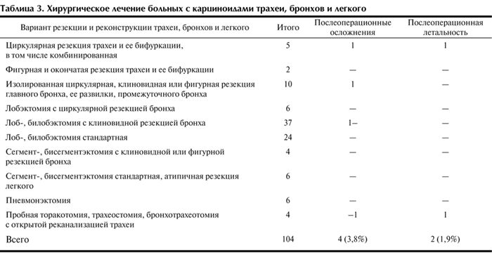 Из особенностей карциноидных опухолей следует отметить повышенную диффузную кровоточивость тканей во время операции у больных как с периферической, так и центральной опухолью, однако достоверных данных, подтверждающих этот факт, не получено. Двум больным в послеоперационном периоде выполнена реторакотомия с подозрением на внутриплевральное кровотечение, которое не подтвердилось.