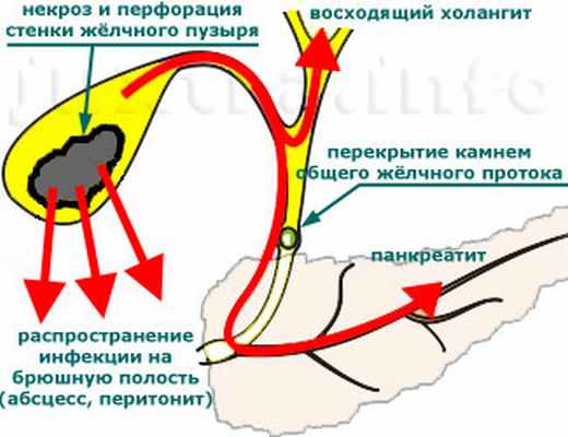 Наиболее частым осложнением калькулезного холецистита является печёночная колика. Если в желчевыводящие пути попадает некрупный (менее 1см) камень, он препятствует нормальному оттоку желчи, при этом в кровь поступают желчные пигменты и развивается желтуха.