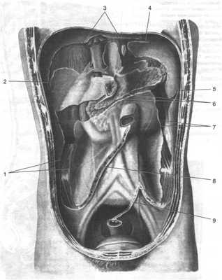 1 — переход брюшины на восходящую ободочную кишку, 2 — правая треугольная связка (Ид. triangulare dextrum), 3 — венечная связка (lig. coronarum), 4 — левая треугольная связка (Ид. triangulare sinistrum), 5 — диафрагмально-ободочная связка (lig. phrenicocolicum), 6 — брыжейка поперечной ободочной кишки (mesocolon transversum), 7 — переход брюшины на нисходящую ободочную кишку, 8 — брыжейка тонкой кишки (mesenterium), 9 — брыжейка сигмовидной кишки (mesocolon slgmoideum). (Из: Синельников Р.Д. Атлас анатомии человека. — М., 1972.—Т. II.)