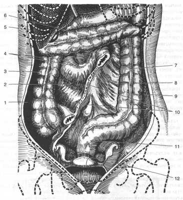 1 — правый боковой канал (canalis lateralis dexter), 2 — правый брыжеечный синус (sinus mesentericus dexter), 3 — восходящяя ободочная кишка (colon ascendens), 4 — двенадцатиперстная кишка (duodenum), 5 — правая печёночная сумка, 6 — поперечная ободочная кишка (colon transversum), 7 — левый брыжеечный синус (sinus mesentericus sinister), 8 — нисходящая ободочная кишка (colon descendens), 9 — левый боковой канал (canalis lateralis sinister), 10 — корень брыжейки (radix mesenterii), 11 — прямокишечно-маточное углубление, 12 — пузырно-маточ-ное углубление. (Из: Netter F.H. Atlas of human anatomy. — Basle, 1989.)