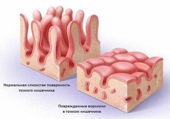 Обычно на слизистой тонкой кишки есть множество ворсинок, которые как ковер покрывают всю ее поверхность. Благодаря им происходит всасывание питательных веществ, витаминов и минералов. При целиакии иммунной системой вырабатываются антитела, которые повреждают ворсинки. Слизистая становится более гладкой, что ведет к нарушению процессов всасывания. Питательные вещества выходят из организма с каловыми массами, не успевая всосаться в кровь, развивается синдром мальабсорбции (нарушения всасывания).