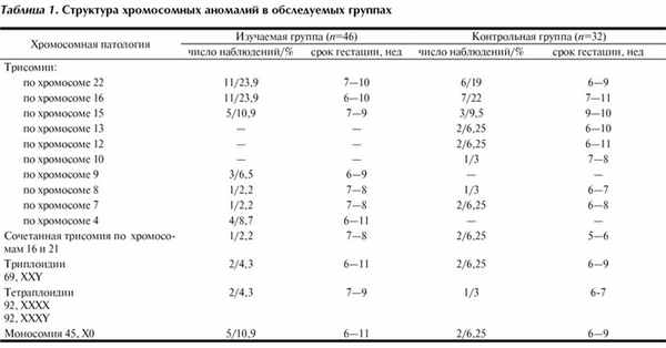В ходе исследования хромосомные нарушения выявлены у 46 (52,3%) пациенток изучаемой группы и 32 (47,8%) — в контрольной.