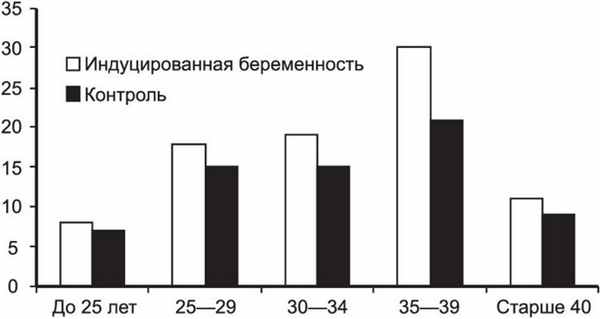 При анализе частоты неразвивающейся беременности в зависимости от возраста матери мы не выявили достоверных различий в изучаемой и контрольной группах (ОР=1,35; р≥0,05) (см. рисунок). Рисунок 1. Распределение частоты неразвивающейся беременности в зависимости от возраста матери.