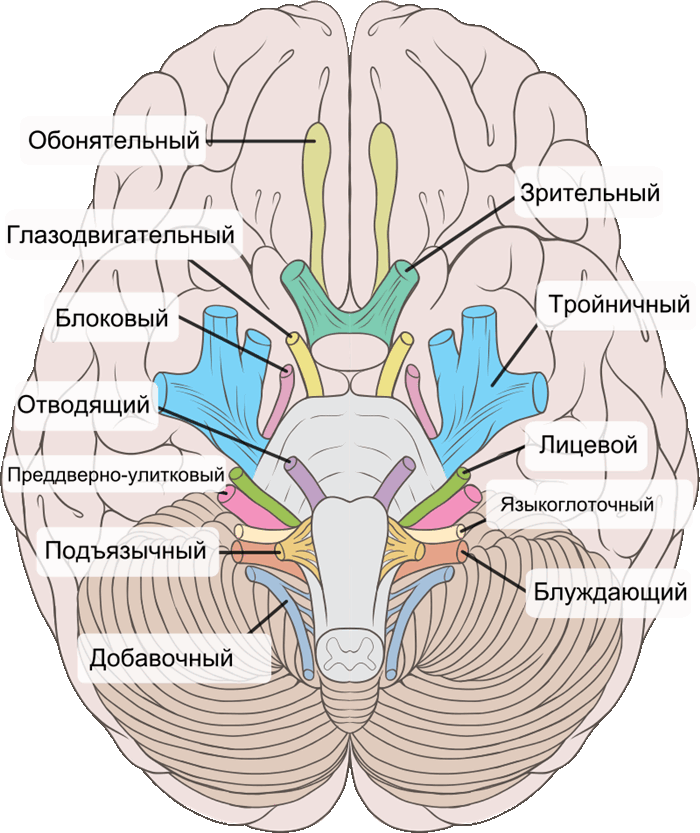 Как видно на рисунке выше, пары черепных или черепно-мозговых нервов обозначаются римскими цифрами от 1 до 12 в зависимости от порядка их расположения и мест выхода.