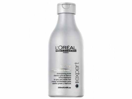 - Лореаль шампунь для седых волос Silver. Уникальная формула GLOSS PROTECT защищает волосы от пагубного воздействия окружающей среды, а также придаёт лёгкий сияющий оттенок. Косметика богата на аминокислоты и увлажнители, она представляет собой целый витаминный коктейль, призванный улучшить состояние вашей шевелюры. Серия Сильвер убирает желтизну, придаёт красоту и сияние пепельным локонам. Стоимость шампуня составляет 700–800 рублей.