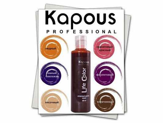 - Kapous. Профлинейка с УФ-фильтрами, защитой от атмосферных явлений и растительными вытяжками. Лечебные свойства выражены ярко. Палитра представлена всего 6 цветами.