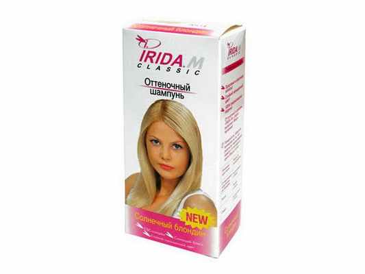 - Irida-M Classic для блондинок. Средство отличается широкой палитрой оттенков. Состав шампуней максимально приближен к натуральному, не агрессивный. Пигменты не проникают внутрь волоса, остаются на его поверхности. В палитре присутствуют розовый, аметист, синий и другие тона. Производитель рекомендует наносить их на натуральные или слегка мелированные волосы. Изделия реализуются в пакетиках, что облегчает использование оттеночного шампуня Ирида. Средство стойкое, выдерживает до 14 смываний. Цена составляет около 100 рублей.