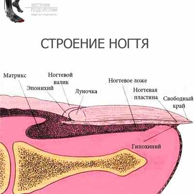 Строение ногтя. Ногтевая пластинка покоится на ногтевом ложе и растетза счет пролиферации эпителиальных клеток матрикса — онихобластов. Матрикс ногтя — участок эпителия ногтевого ложа, располагающийся под луночкой (белая полоска полулунной формы) и корнем ногтя. Граница матрикса расположена на 7—8 мм проксимальнее заднего ногтевого валика. Ногтевое ложе богато кровеносными сосудами, что придает ногтю характерный розовый цвет. Ногтевая пластинка с трех сторон ограничена ногтевыми валиками (задним и боковыми). Роговой слой эпидермиса заднего ногтевого валика образует эпонихий — надногтевую пластинку, которая закрывает доступ к корню ногтя