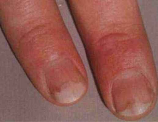 довольно редко, в основном при сердечной недостаточности и циррозе печени, сопровождающемся гипоальбуминемией. Двухцветный ноготь: розовая или коричневая
