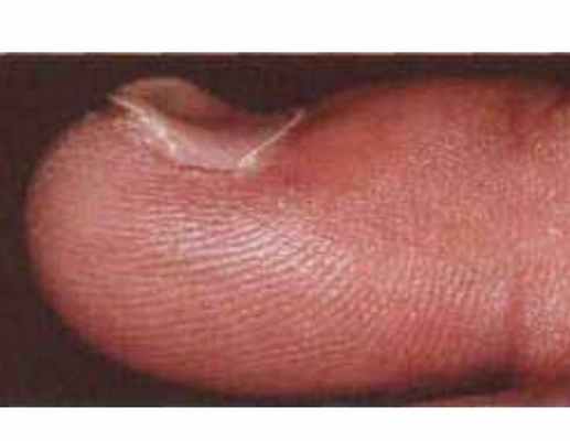 При врожденном буллезном эпидермолизе дистрофия ногтей весьма характерна, особенно при дистрофической форме. Она может заканчиваться рубцеванием области ногтя и полной анонихией [1].