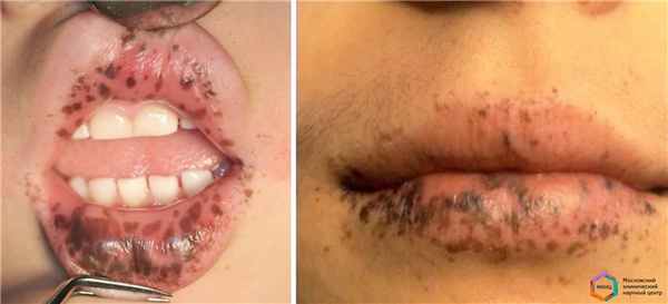 За несколько месяцев до этого пациентка обнаружила кровь в стуле, после чего обратилась за помощью в поликлинику по месту жительства, где при колоноскопии выявлено более 50 полипов толстой кишки и заподозрено злокачественное новообразование. Пациентка сообщила, что ее мать умерла от рака толстой кишки в возрасте 40 лет. При осмотре обращала на себя внимание светлая фарфоровая кожа с множеством веснушчатых пигментных пятен, равномерно расположенных по всему телу, рыжий цвет волос и светлый оттенок глаз. Однако скопление пигментаций в области губ усиливалось, они переходили на слизистую оболочку полости рта и щек, где размеры пятен достигали 5 мм в диаметре. Пациентка пришла на прием с родной сестрой, у которой подобных особенностей не наблюдалось.