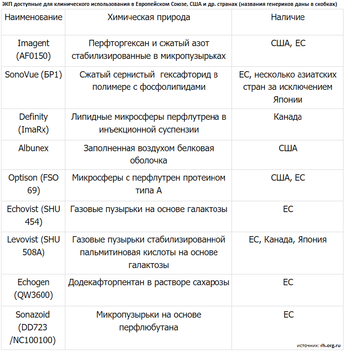 подробнее в статье «Контрастные препараты для ультразвукового исследования» Фомина С.В., Завадовская В.Д., Юсубов М.С., Дрыгунова Л.А. (Сибирский государственный медицинский университет, г. Томск), Филимонов В.Д. (Национальный исследовательский Томский политехнический университет, г. Томск); журнал «Бюллетень сибирской медицины» № 6, 2011 [читать]