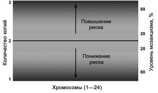 1. Эмбрионы с низким уровнем мозаицизма (низкий риск неблагоприятного результата переноса эмбриона) предпочтительнее эмбрионов с высоким риском мозаицизма, который в свою очередь может обусловливать дальнейший неблагоприятный исход. Относительный процент мозаицизма является более благоприятным прогностическим фактором, нежели вовлечение конкретной хромосомы (хромосом). Конкретные хромосомы связаны с конкретными синдромами, и это должно обсуждаться при консультировании. Эмбрионы с высоким риском мозаицизма нужно переносить с осторожностью и только после соответствующей генетической консультации.