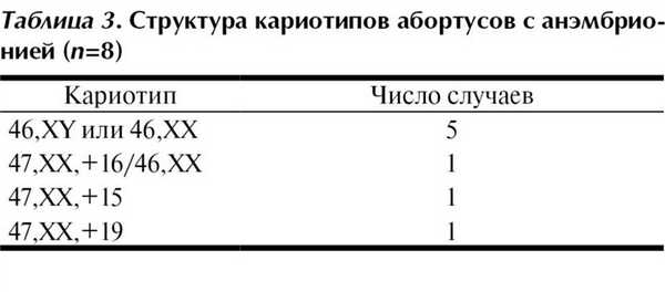 Определенный интерес представляет изучение структуры хромосомных аномалий у абортусов с наиболее тяжелой морфологической формой нарушений эмбриогенеза - анэмбрионией. По результатам собственных исследований, среди 8 случаев анэмбрионии нами были выявлены 3 случая анеуплоидного кариотипа с трисомией по 15, 16 и 19-й хромосоме (табл. 3). В ряде исследований методом сравнительной геномной гибридизации (CGH) показано, что у абортусов с анэмбрионией имели место как моносомии (7, 15, 21 и 22-й хромосом), так и трисомии (1, 2, 15 и 19-й хромосом) [1, 8].