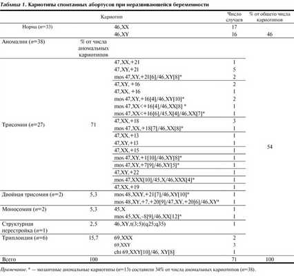Проблема невынашивания беременности продолжает оставаться актуальной и социально значимой в практике акушера-гинеколога. Самопроизвольные аборты составляют 15-20% от всех желанных беременностей. Среди различных форм невынашивания беременности особое место занимает несостоявшийся аборт (неразвивающаяся беременность) - гибель эмбриона в раннем сроке беременности с длительной задержкой в полости матки. В структуре репродуктивных потерь число случаев неразвивающейся беременности составляет 10-20%. Причины неразвивающейся беременности многочисленны и нередко комплексны [3]. Особую роль в этиологии невынашивания беременности играет хромосомный дисбаланс. Так, в 6-7 нед беременности 60-75% абортусов имеют аномальный кариотип, в 12-17 нед - 15-20%, и в 17-28 нед - только 2-7% [14].