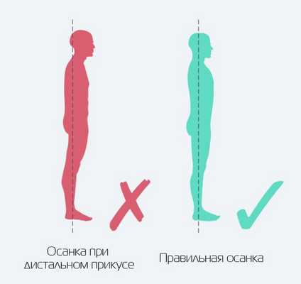 Дистальный прикус визуально отражается на осанке — все тело немного наклоняется вперед. Для пациента с дистальной окклюзией характерна выраженная сутулость, удлиненная наклонённая вперед шея, выпирающий живот.