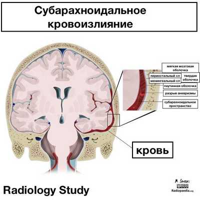 Субарахноидальное кровоизлияние — состояние, обусловленное мозговым кровотечением, при котором кровь скапливается в подпаутинном пространстве церебральных оболочек. Характеризуется интенсивной и резкой головной болью, кратковременной потерей сознания и его спутанностью в сочетании с гипертермией и менингеальным симптомокомплексом. Диагностируется по данным КТ и ангиографии головного мозга; при их недоступности — по наличию крови в цереброспинальной жидкости. Основу лечения составляет базисная терапия, купирование ангиоспазма и хирургическое выключение церебральной аневризмы из кровотока.