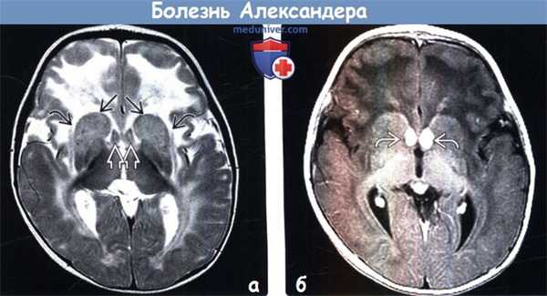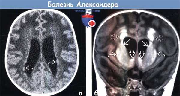 • Предполагайте инфантильную форму БА при макроцефалии в сочетании с лейкодистрофией, преобладающей в лобных долях