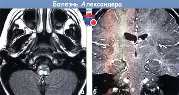 (б) МРТ, постконтрастное Т1 -ВИ, корональный срез: у этого же пациента определяется очаговое накопление контрастного вещества в средних ножках мозжечка. Обратите внимание на отсутствие изменений со стороны БВ больших полушарий. Ювенильная и взрослая формы болезни Александера (БА) характеризуются вовлечением ствола мозга (особенно продолговатого мозга), мозжечка и шейного отдела спинного мозга (особенно у взрослых), с минимальным вовлечением в процесс супратенториальных структур или без него.